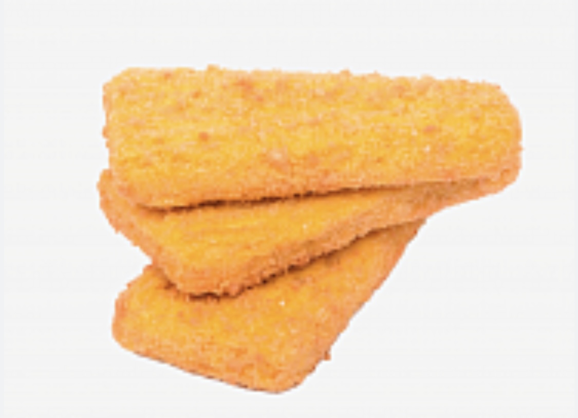 Рыба лососевых пород, комплексная панировка (сухари панировочные: мука пшеничная в/с, вода, дрожжи, масло растительное, соль, декстроза), кляр: вода, мука пшеничная в/с, крахмал картофельный, мука кукурузная, соль, молоко сухое обезжиренное, яичный порошок, краситель – куркума, загустители – гуаровая и ксантановая камеди), растительный белок (соя), клетчатка пшеничная, лук сушеный, смесь вкусо-ароматическая “Лосось”, растительное масло, соль. стабилизатор – пирофосфат натрия, краситель – паприка.