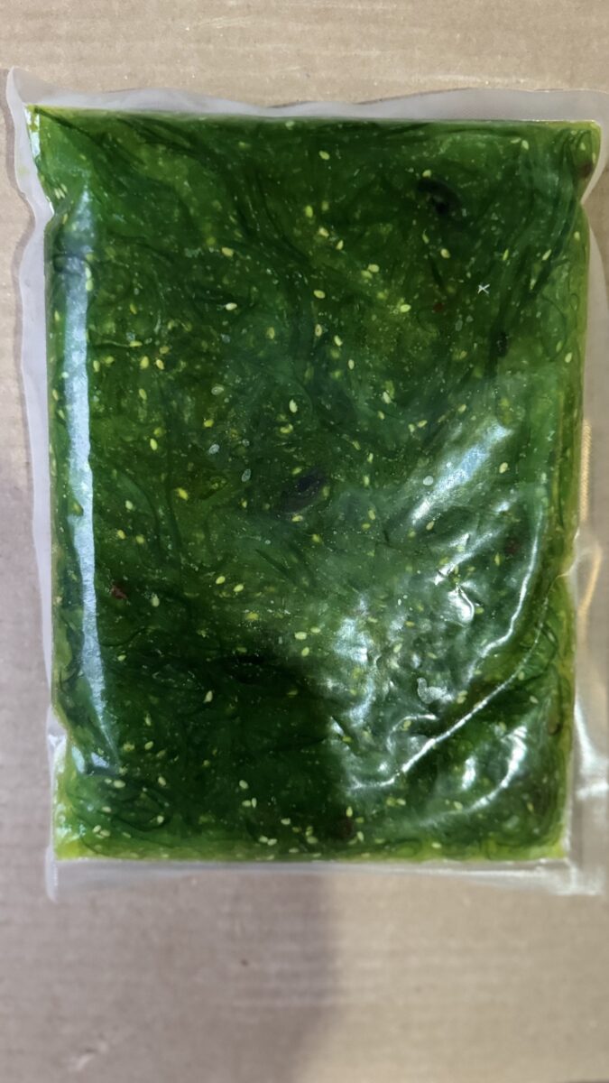 Состав/Ingredients: морские водоросли (Undaria Pinnatifida), вода, фруктозный сироп, древесный гриб, агар-агар, уксус, кунжутное масло, сахар, соль, кунжут, усилитель вкуса и аромата Е621, перец чили, пищевой краситель Е102, пищевой краситель Е133 / Seaweed (Undaria Pinnatifida),